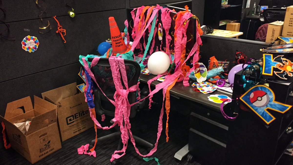 I return to work to find my desk birthday bombed. Even the mouse was wrapped in tissue paper