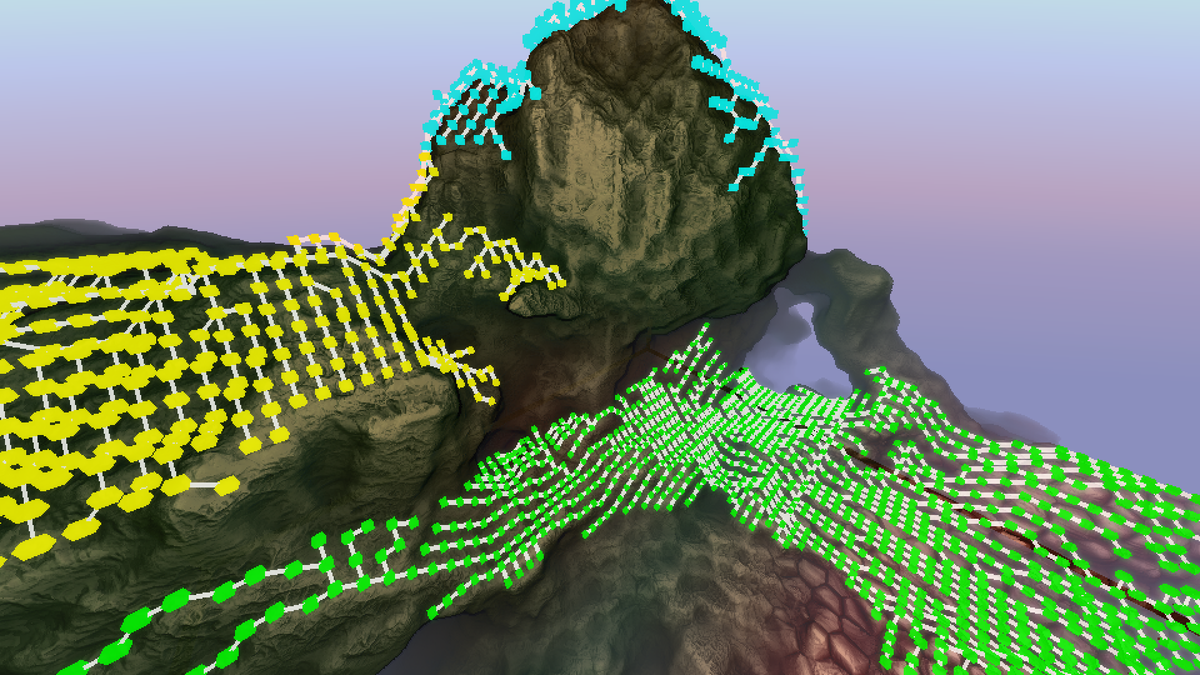 I've been working on path finding for fully destructible environments. It's basically A* with smoothing, but on a coarse voxel grid that is evaluated on the fly.pic.twitter.com/fz6LFFiImL