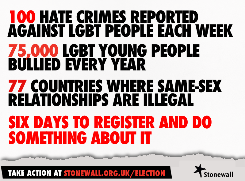 Register to vote before 20 April and make sure your voice is heard. http://www.stonewall.org.uk/election