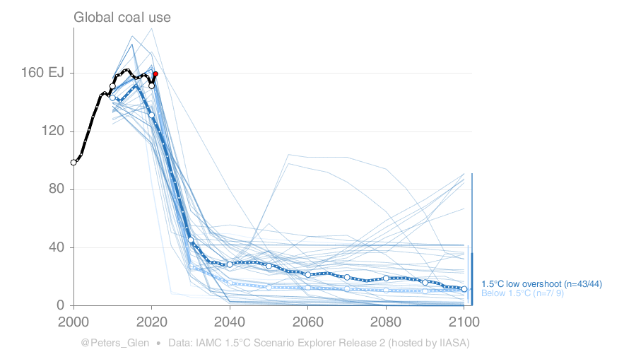 What is the shelf life of a scenario for policy applications? According to the IPCC SR15 (published 2018), coal needs to drop ~70% from 2020 to 2030, but most of the scenarios already have a big drop by 2020. Only 2 scenarios have higher coal in 2021. What number do I use?pic.twitter.com/FZeGdCMHz9