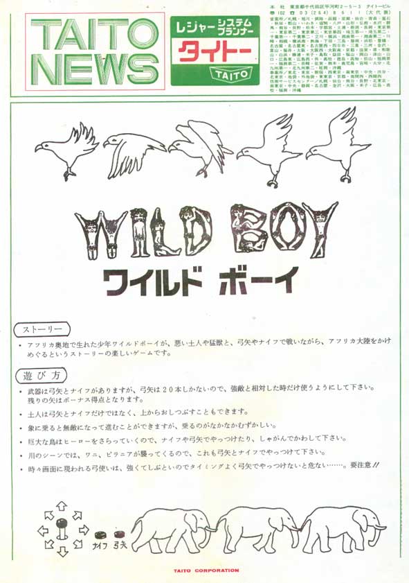 There's a flyer for the Wild Boy, but it's pretty plain (no screenshots, seems like it's from some Taito newsletter). The article describes it as a Spartan X-type game that could also be seen as an upgraded version of Jungle King where you could walk on elephants.pic.twitter.com/JCGPWDb5Lt