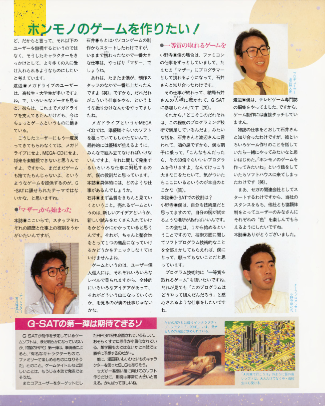 Beep! MegaDrive (August 1992) feature on G-Sat, a joint venture of Sega and ad agency Asatsu-DK and developer of MD Doraemon. Pictured: Producer (and Hexcite creator) Masato Watanbe, director Tatsuya Ishii, chief programmer Takayuki Onodera.pic.twitter.com/UPbovJAT6y