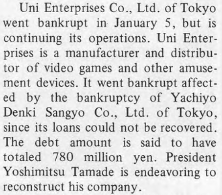 "Yachiyo Denki Bankrupt" (Game Machine 1984/9/15, pg. 7). Unfortunately, this issue is a little faded and blurry, so I'm having trouble OCRing it. The president of Yachiyo Denki Sangyo (株式会社八千代電器産業) was Mikio Ikeda (池田光博), president of HAL Laboratory.pic.twitter.com/CCX50dpnQJ