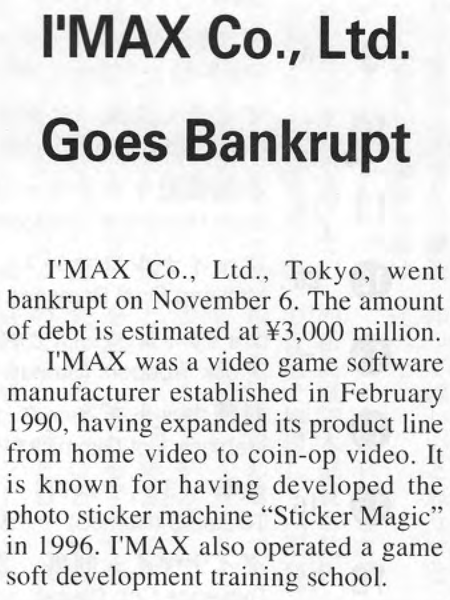 I'MAX Co., Ltd. Goes Bankrupt (English: Game Machine 1998/12/15, p. 22; Japanese: Game Machine 1998/12/1, p. 1)pic.twitter.com/RJgOlcdngx