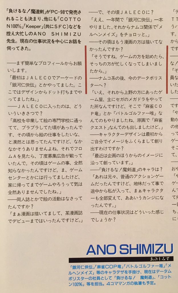 1993 interview with illustrator Ano Shimizu (Märchen Maze, Kendo Rage, Battle Golfer Yui, Mahjong Quest, Zeroigar)https://twitter.com/x_hisabilly_x/status/676419521595355136 …