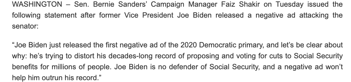 Still can’t believe the audacity of screaming “Biden said social security adjustments” when Bernie said literally exactly the same thing. Its like when Bernie tried to attack Clinton over the crime bill when he actually voted for it. Just a pattern of hypocrisy & demagoguery