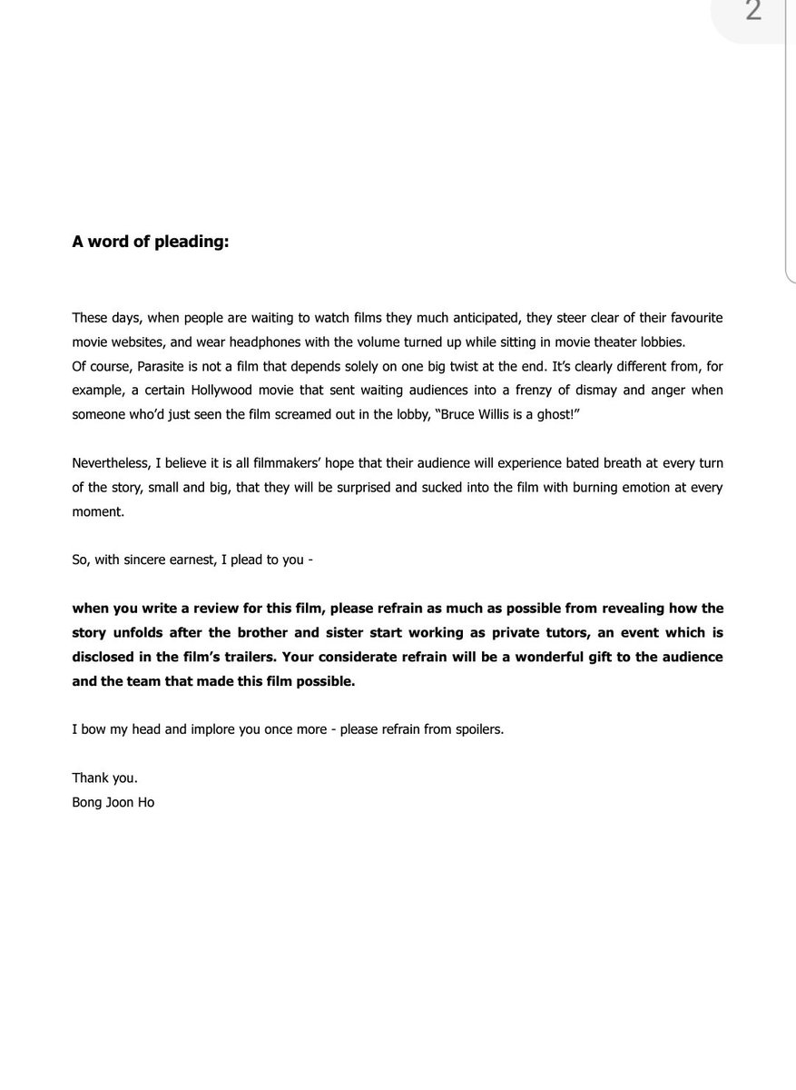 #BongJoonHo demands your silence on his latest film, PARASITE. #BongHivepic.twitter.com/EDew6ybiKq