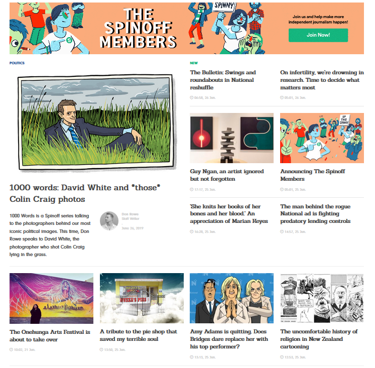 There is no news website which uses illustrations and cartoons quite like @TheSpinoffTV. Look at that Home Page.