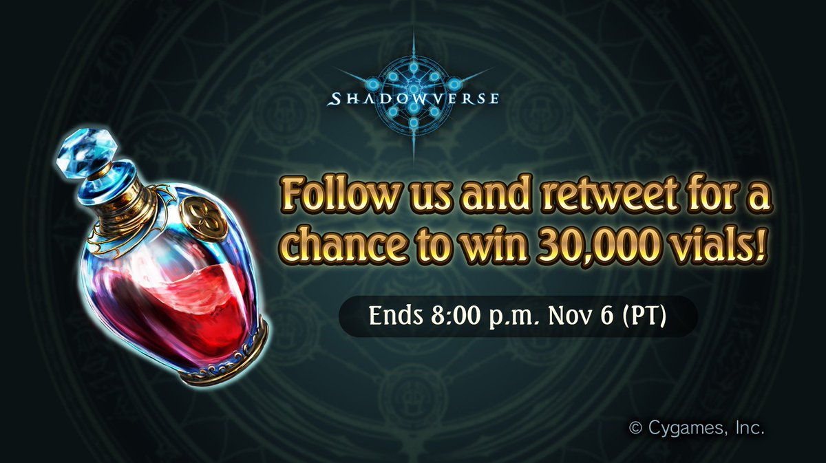 Retweet the above tweet for a chance to win 30,000 vials! Check out our website for more details: https://shadowverse.com/news/event/news-0035 …pic.twitter.com/11EHjeTyYa