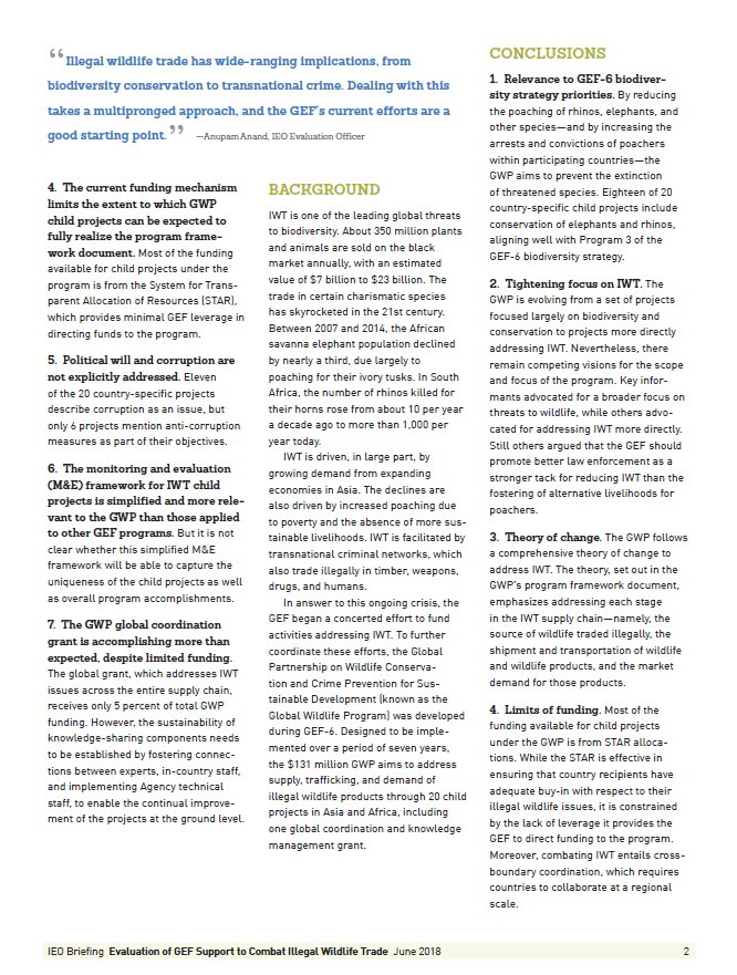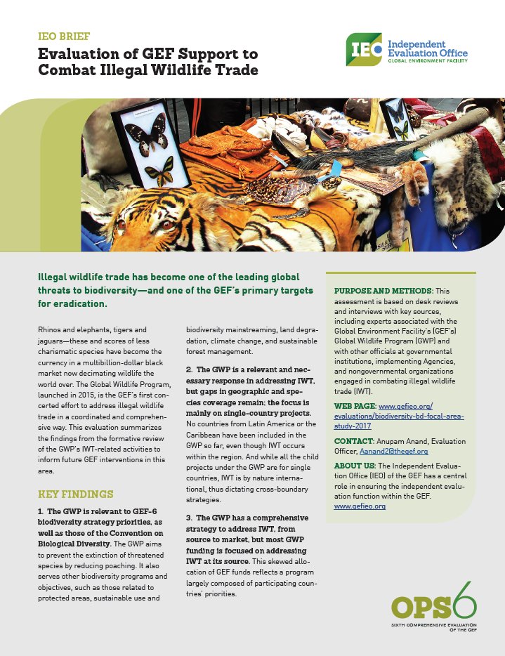 The Global #Wildlife Program is the #GEF’s first concerted effort to address illegal wildlife trade in a coordinated & comprehensive way. This #evaluation summarizes the findings from the formative review of the GWP’s #IWT-related activities https://bit.ly/2JGaGzm pic.twitter.com/JB03imqnRh