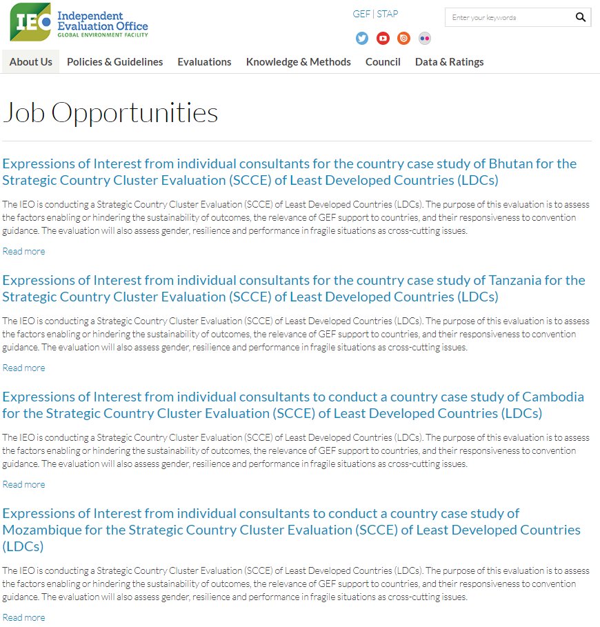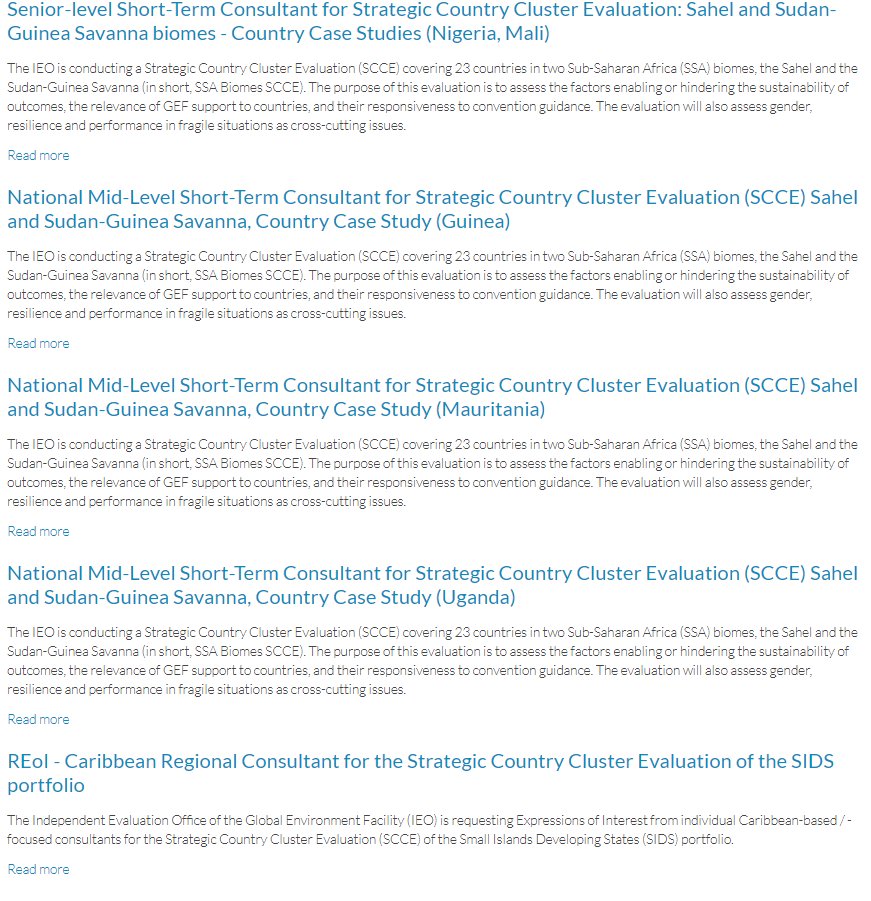 We added more job opportunities for country case studies part of the Strategic Country Cluster #Evaluations → http://www.gefieo.org/news/job-opportunities … Consultants needed for #Bhutan #Tanzania #Cambodia #Mozambique #Nigeria #Mali #Mauritania #Uganda #Caribbeanpic.twitter.com/Q4CMzn3W4o