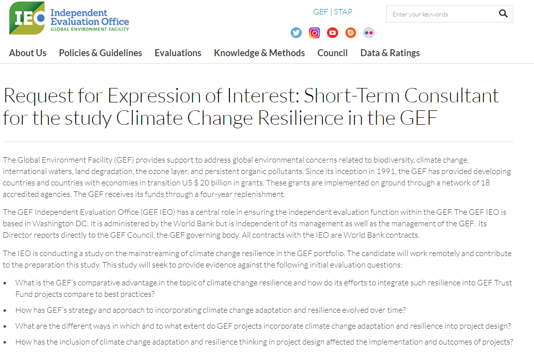 The Independent #Evaluation Office of the #GEF is seeking to hire a short-term consultant for the study Climate Change #Resilience in the GEF