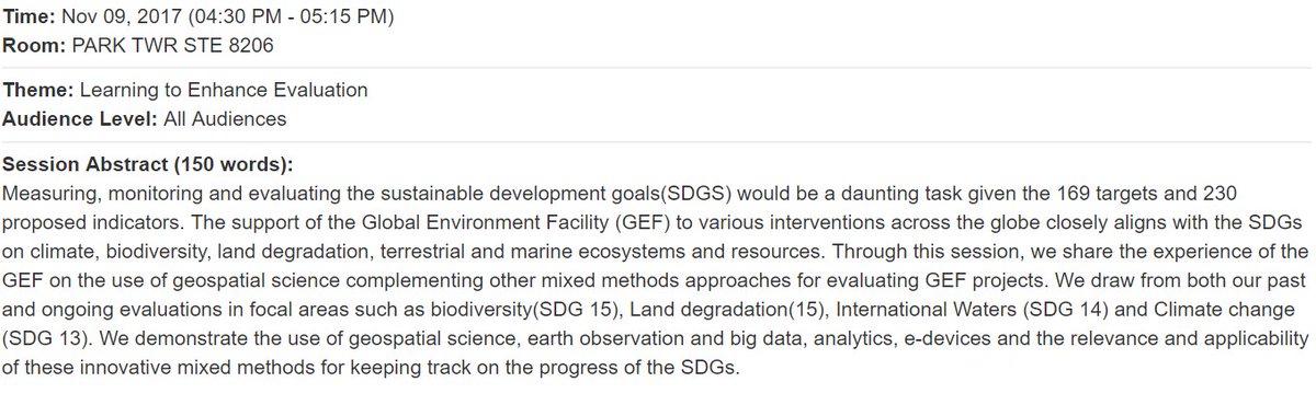 Join our session TODAY at 4:30 pm on Leverging #geospatial science for tracking the #SDGs through measurement and #evaluation of GEF interventions #eval17pic.twitter.com/FTT5IyGp9P