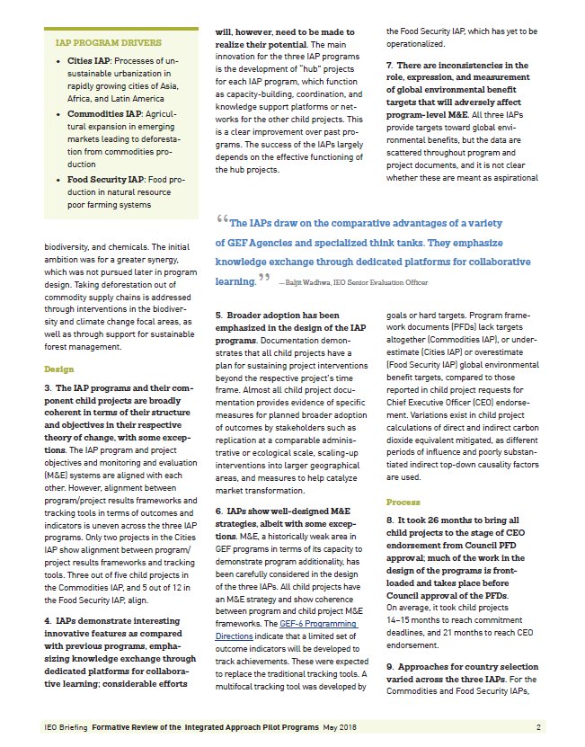 The #GEF's Integrated Approach Pilot (IAP) programs focus on #foodsecurity #sustainablecities and #commodities. Our review on the design elements & early processes of the program, as well as conclusions & recommendations can be found on our website https://bit.ly/2rMBRlb pic.twitter.com/FfI6Zv4VeC