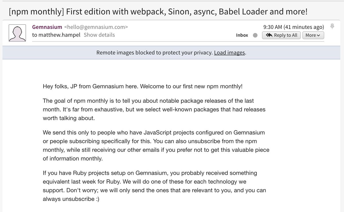 I should have included the link (in case you didn't get one) -- the updates are short and to the point!https://gemnasium.com/blog/npm-monthly-first-edition-webpack-sinon-async-babel-loader-and-more …