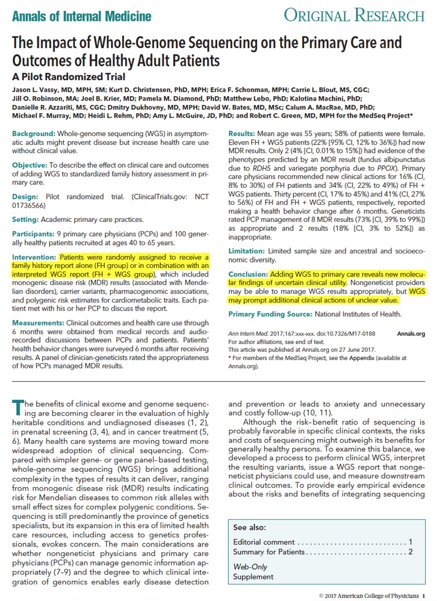 Should whole genome sequencing be done in healthy people? A small randomized trial w/interesting results http://annals.org/aim/article/2635325/incorporating-whole-genome-sequencing-primary-care-falling-barriers-next-steps …