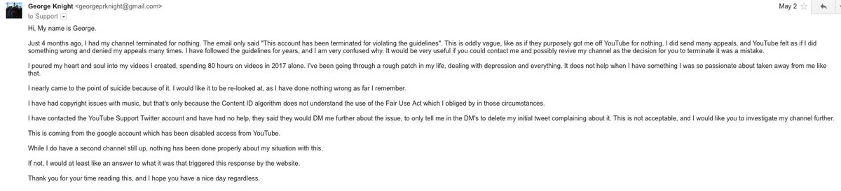 This is an email I tried to send through to YouTube about 2 months ago but failed, if you could get back to me about my termination issue that would be great. Please read my email on what I had to say:pic.twitter.com/rN25Mp5Yio