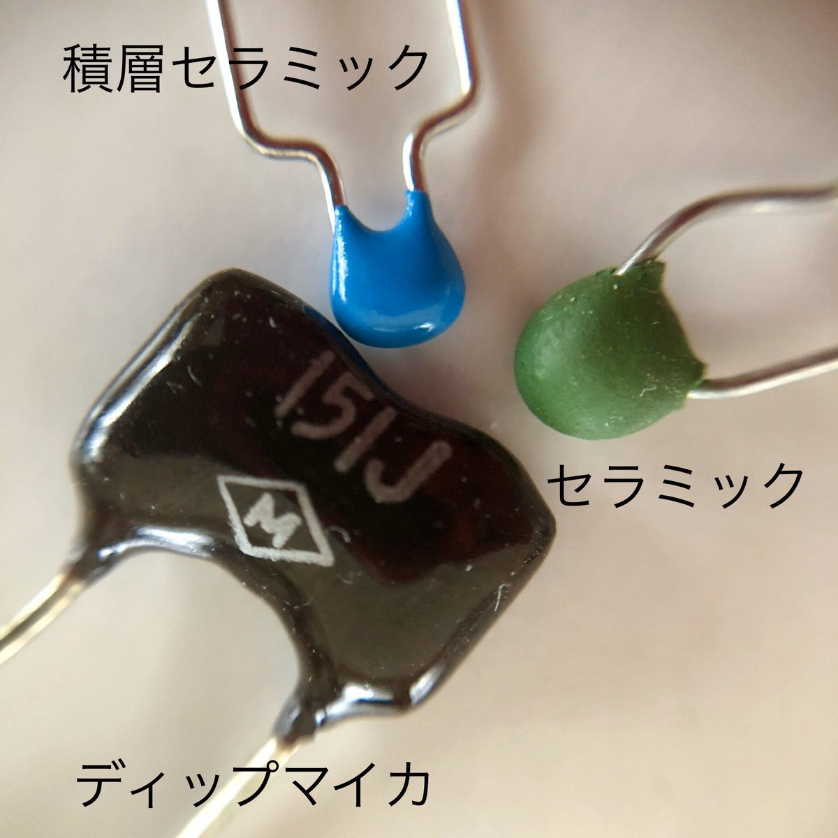 試したコンデンサは3種。緑がセラミック。青が積層セラミック、濃茶で大きいのがディップ。いずれも150pF。まず緑は話にならない。音が悪い。ダイナミックレンジが狭くなる。濃茶は悪くない。あと一息「抜け」が欲しい。青が今のところ最高。pic.twitter.com/5AADCf6Ts8