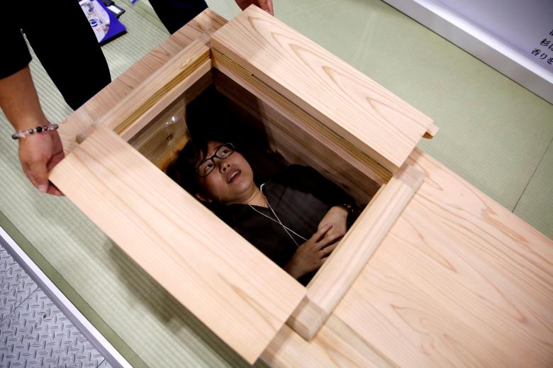 We are all lying in a coffin trying it out. "A visitor lies in a coffin to try it out at the ENDEX JAPAN 2018 funeral and cemetery show in Tokyo" (Toru Hanai)pic.twitter.com/lpyWJlFsPi
