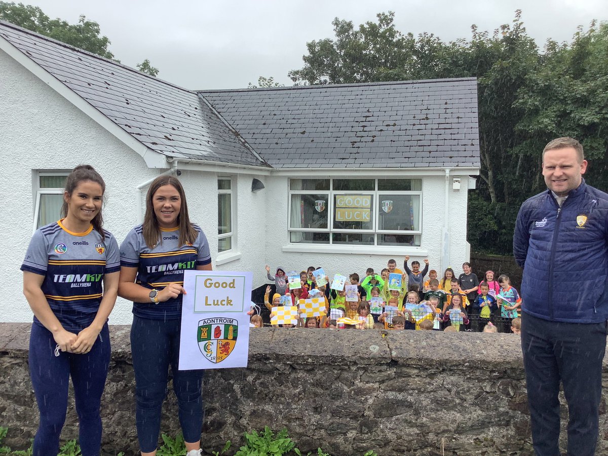 @CamogieAontroim in the ALL-IRELAND FINAL! Thanks to past pupil@OrlaghO645 & her@RuairiOgCLG team mate@ColleenPatt for coming to present our poster competition winners with their prizes & receive a good luck card from everyone@Glenann_PS#SaffronFridays