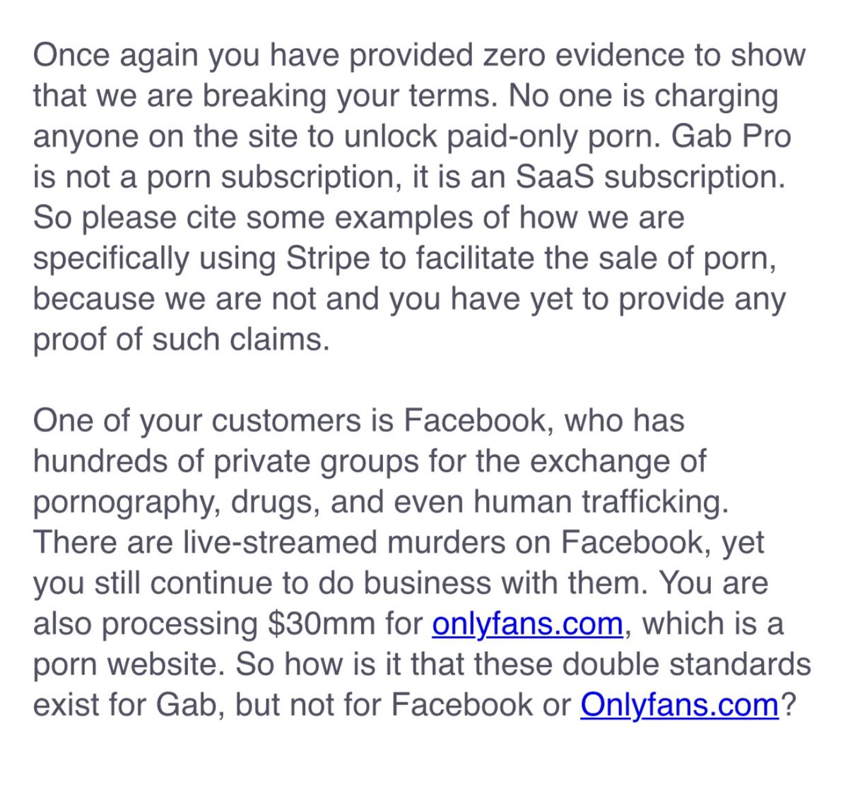 Our reply to Stripe, who has yet to cite even a single example of Gab breaking their terms. Just baseless accusations and sophistry.pic.twitter.com/MJ6DEmdBZ0
