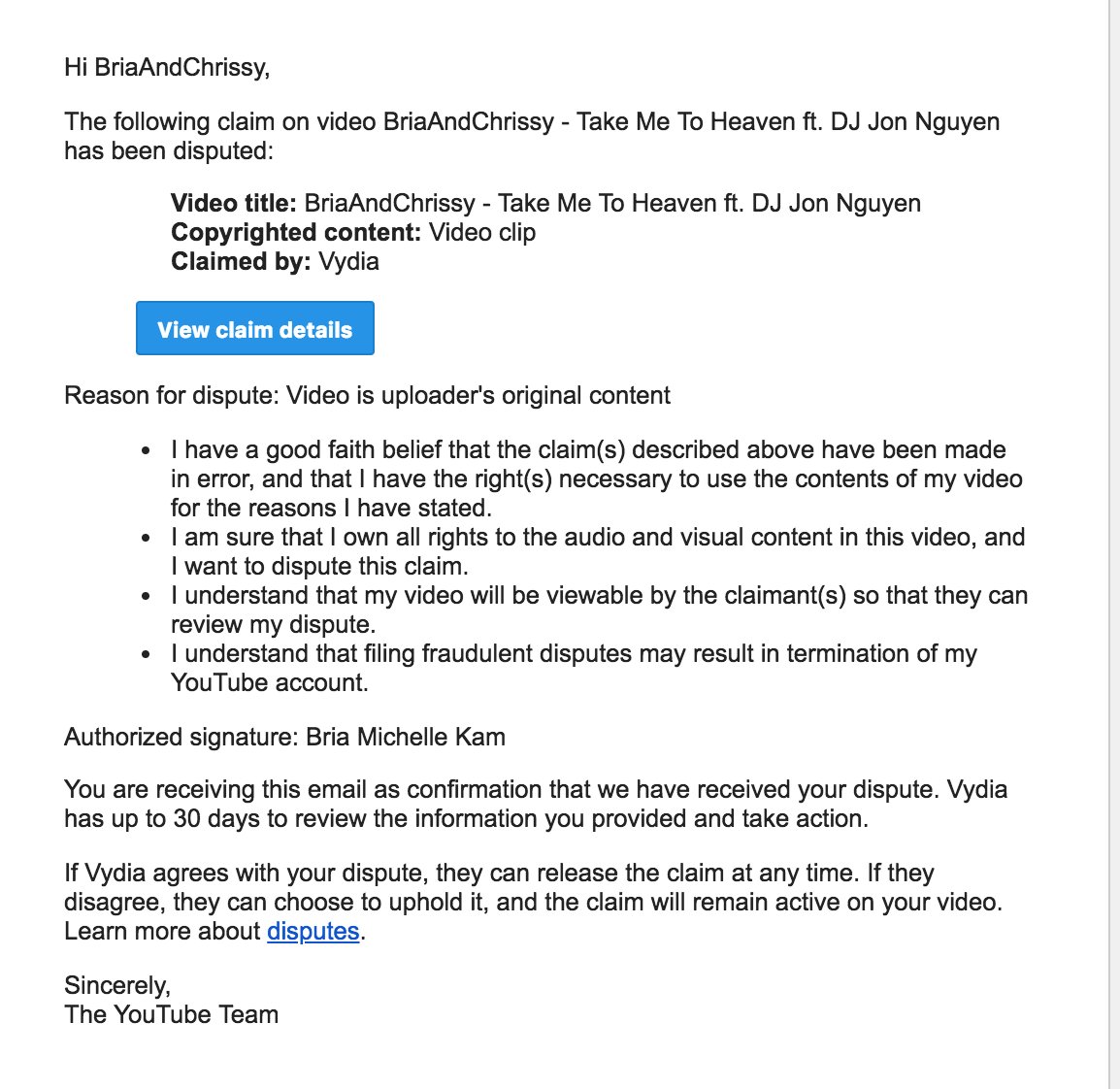 Can you all explain @teamyoutube why our original music video "Take Me To Heaven" is now claimed by Vydia? Tried to dispute this & you all said its under this companies control. We'd like to have our original song & video back pls. "If they disagree they can choose to uphold it"pic.twitter.com/mSuG6tbaMu