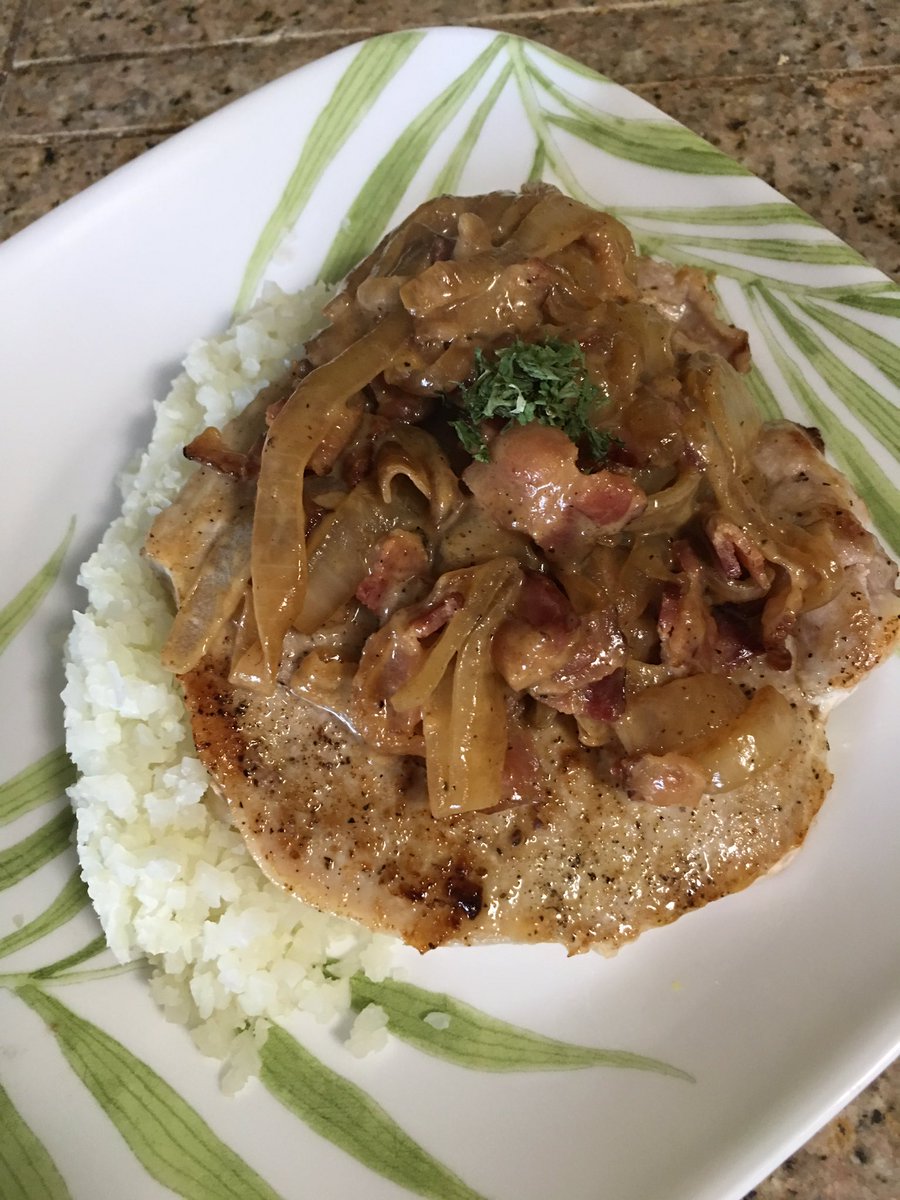 Caramelized onion and bacon smothered pork chops with riced cauliflower.pic.twitter.com/UuuJXqi1W6