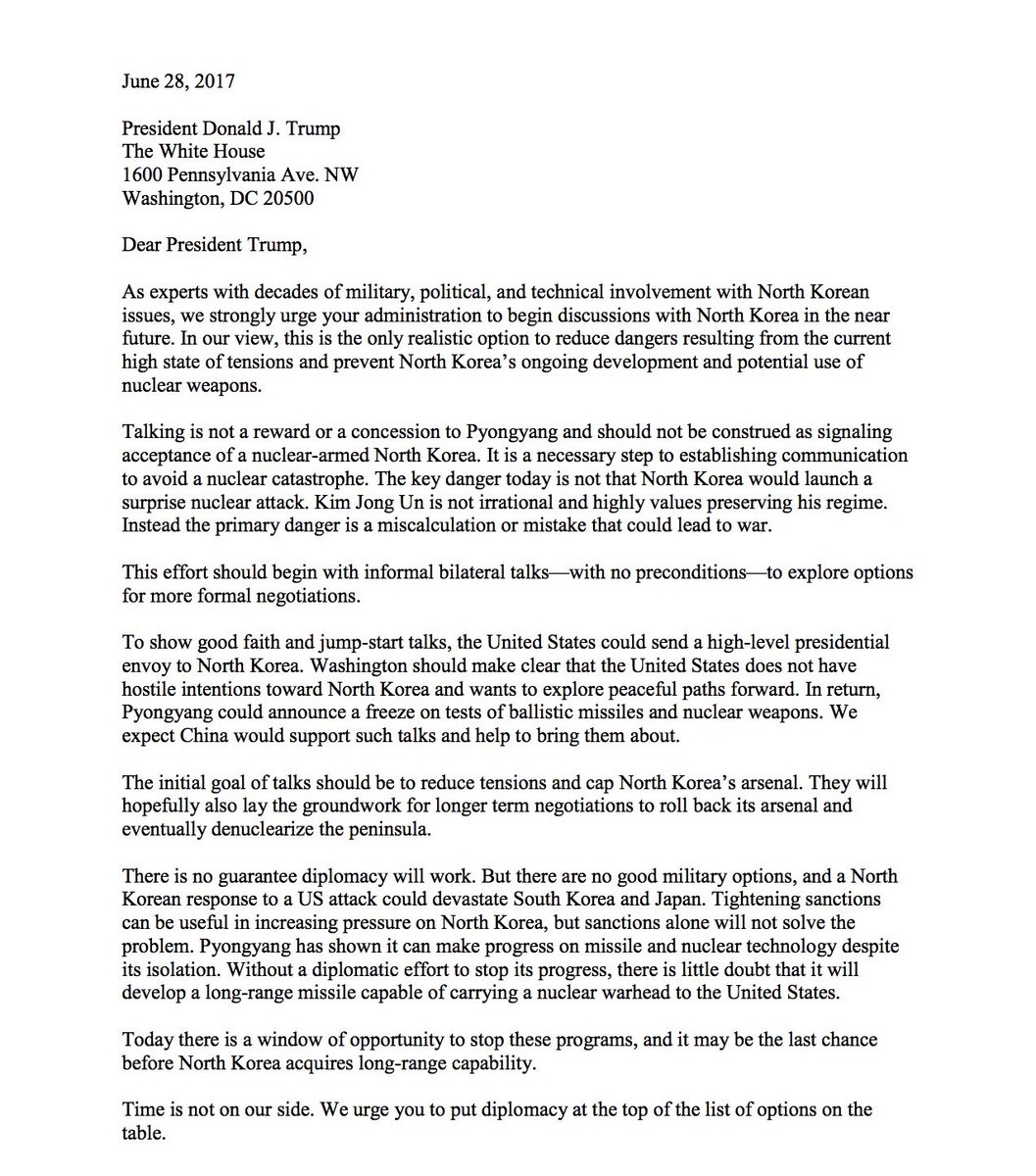 "This effort should begin with informal talks - with no preconditions... [and] a high-level presidential envoy to North Korea."https://twitter.com/SecDef19/status/880198471579443200 …