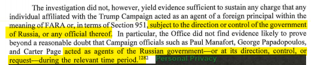 Given that Mueller could not establish that even Carter Page coordinated with Russia, nor could he find evidence to establish that Carter Page was an agent of Russia, isn't it time to re-visit whether the FISA warrant to spy on Carter Page was justified? That's a big deal:pic.twitter.com/nsr1jS46ck