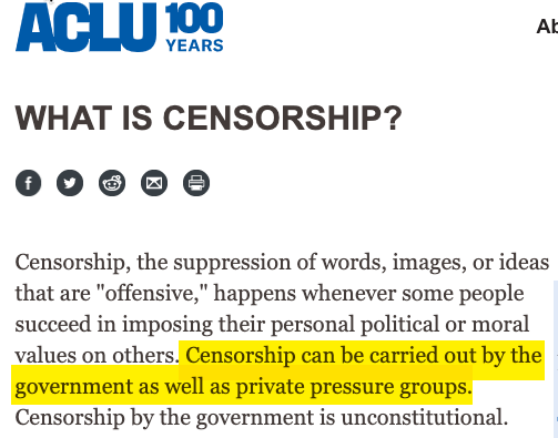 "That censorship occurs not only by state action but also cultural and societal coercion has often been explicitly stated by the ACLU itself. That’s why the civil liberties group has referred to Facebook’s banning of offensive speech as “censorship." Its Censorship page also:pic.twitter.com/Z9g8BEZl5c