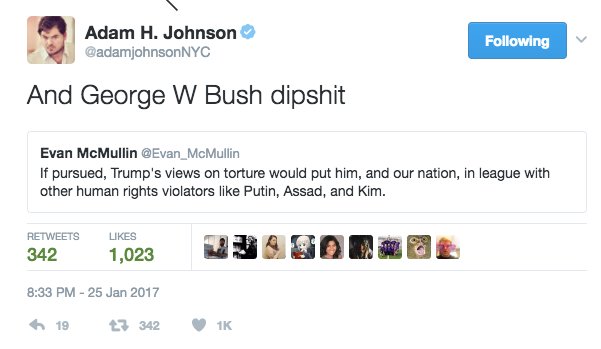 @greghlbrt@Evan_McMullin@adamjohnsonNYC You're misinformed. He justified waterboarding just a few months agohttps://twitter.com/ggreenwald/status/824416500522086401 … -