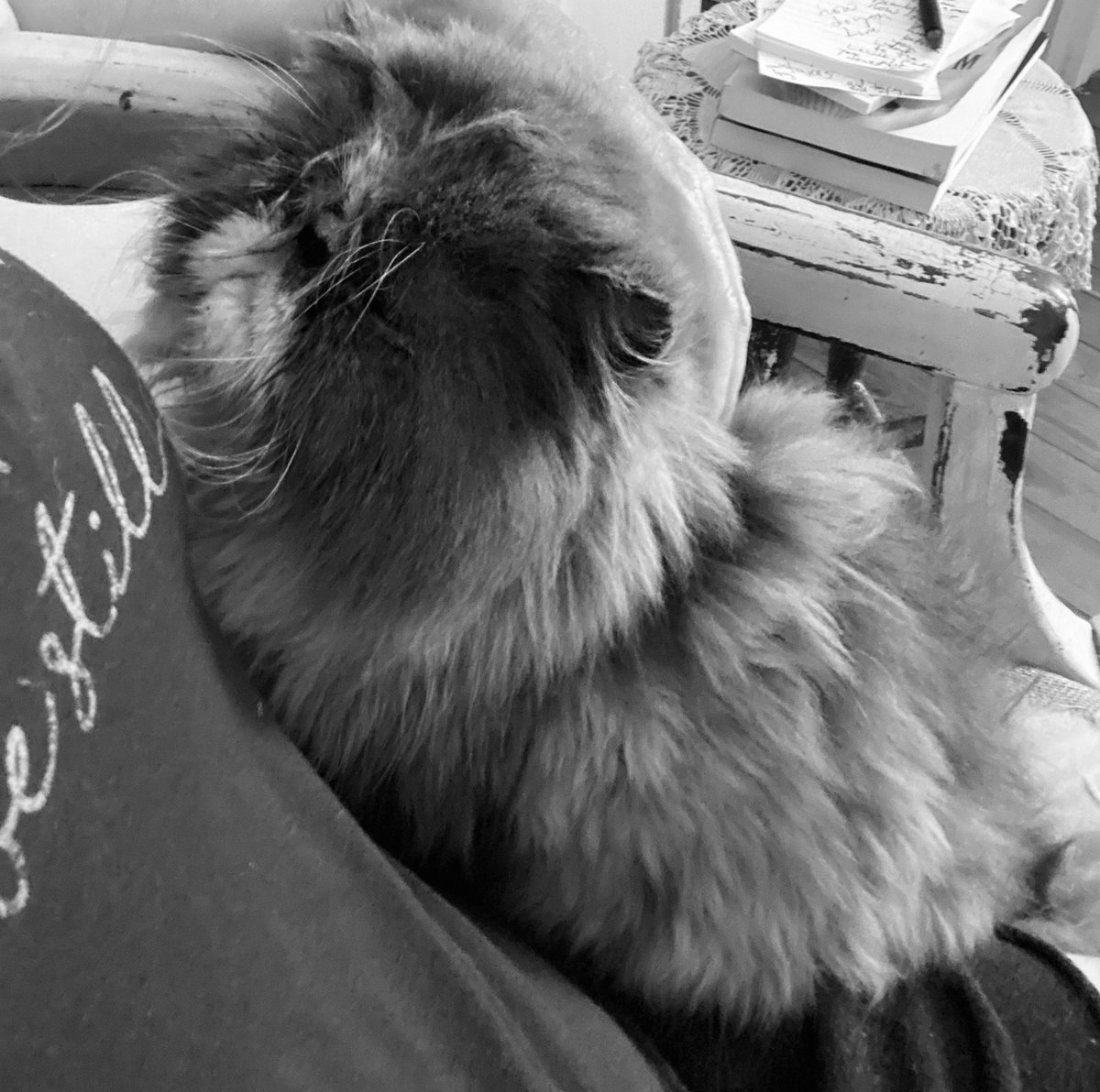 finnius peabody smudge came for a cuddle after barfing on the kitchen floor. this is the glamorous Life i lead. haha. he is persnickety about cuddles, but now he has decided he likes to sit with me in this chair and put a little paw on my cheek. i tried to get that but couldn't.pic.twitter.com/d9sPB9Q5a5