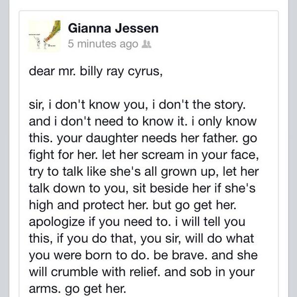@giannajessen:dear @billyraycyrus..i wrote you a letter. here it is. i am asking you to go get your daughter.Love, g