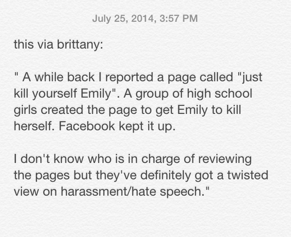 wowie. facebook would not remove a page encouraging a girl named emily to kill herself. what is wrong with them?!pic.twitter.com/kCC3A3X6ic