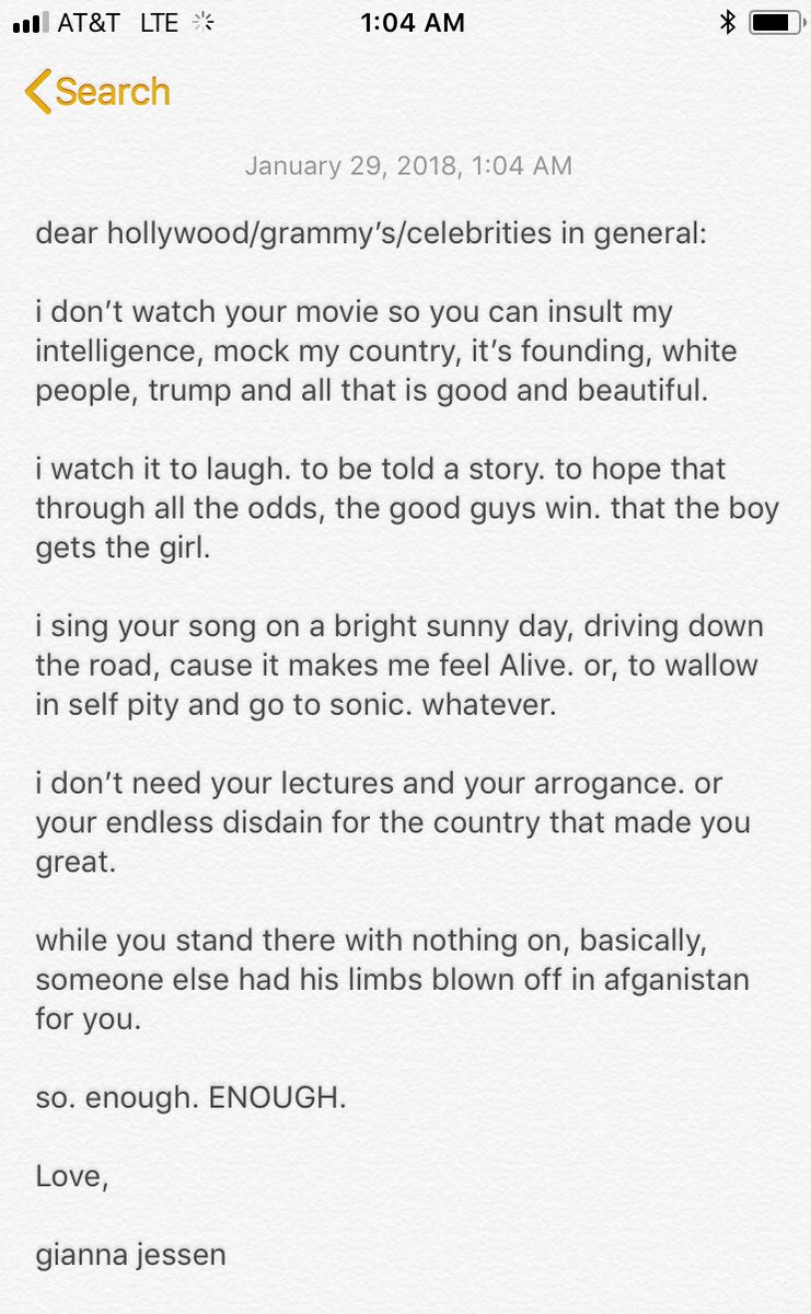 my little missive to hollywood/celebrities/grammy awards..while you stood there mocking the country, a soldier had some limbs blown off for your Freedom. stop insulting our intelligence and the country that gave you everything you have. in short: SHUT UP.pic.twitter.com/6nlVJggzBI