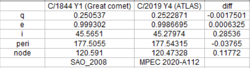 New comet C/2019 Y4 (ATLAS) has orbital elements very similar to those for C/1844 Y1 (Great Comet). The suggestion was initially made by M. Meyer when the 2019-2020 arc was ~three days.pic.twitter.com/9kRTALy7U5