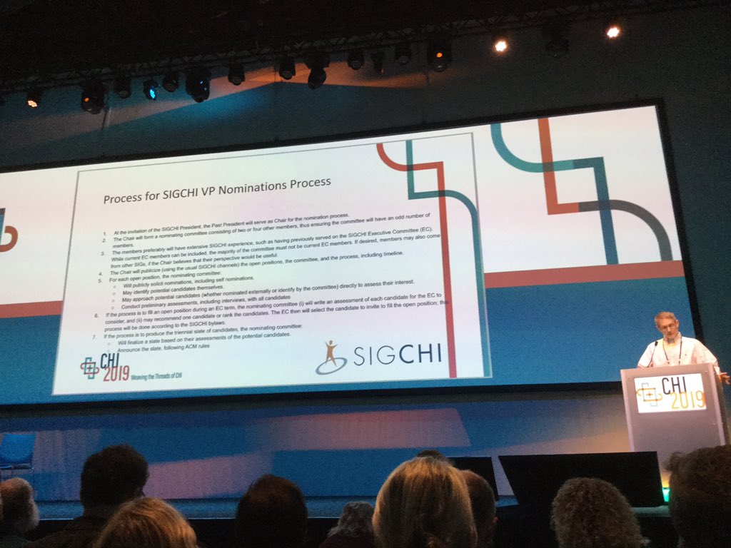 It’s the @sigchi townhall meeting at #chi2019 - beginning soon. I’ll be threading here. Hopefully (if WiFi holds up)pic.twitter.com/6p0lqkggvT