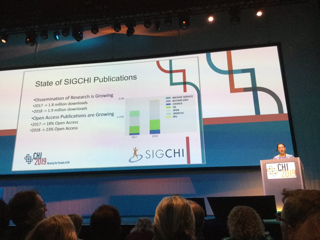 Next up is @JRicoWilliamson to talk about publications and the future of templates etc. She’s involved a panel after this too. #chi2019 downloads of our content is up to 1.9M downloads which s great. And more and more are open access.pic.twitter.com/ymDjGZUY6W