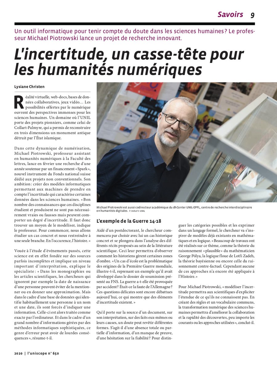 #humanitésnumériques. Présentation du projet@fns_ch dirigé par@true_mxp, Prof. en Section des sciences du langage et de l’information@unil, dans le dernier numéro de l’uniscope (page 9) http://bit.ly/2vPynU2 pic.twitter.com/yj4TIp6cYb