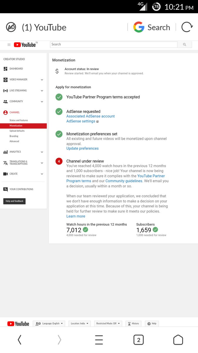 @TeamYouTube @YTCreators @YouTubeIndia Dear team, I have 1660 subscribers and 7012 hours watch time. I daily get 5000 views but still my channel not monitized. I can't wait because I upload video on daily basis and spend many hours in a day. Channel URL - https://www.youtube.com/channel/UC_Rh9qAJKeceGA9WizFD1Lw …pic.twitter.com/EwcjZ3OtEc