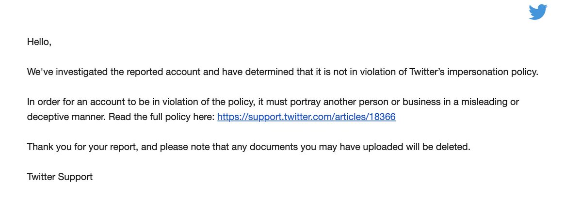 I reported this account, who has copied my exact handle and it was temporarily taken down. I had to send in a copy of my driver's license to prove my identity. Then twitter re-instated it saying its not in violation. Please keep reporting it. https://twitter.com/girlsreallyruIe pic.twitter.com/ZJZmpf8xEW