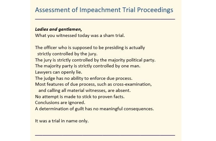 My take on some of the indicators that the impeachment trial of Donald John Trump was never going to be a fair trial. It's not particularly flattering.pic.twitter.com/HbzroweBD2