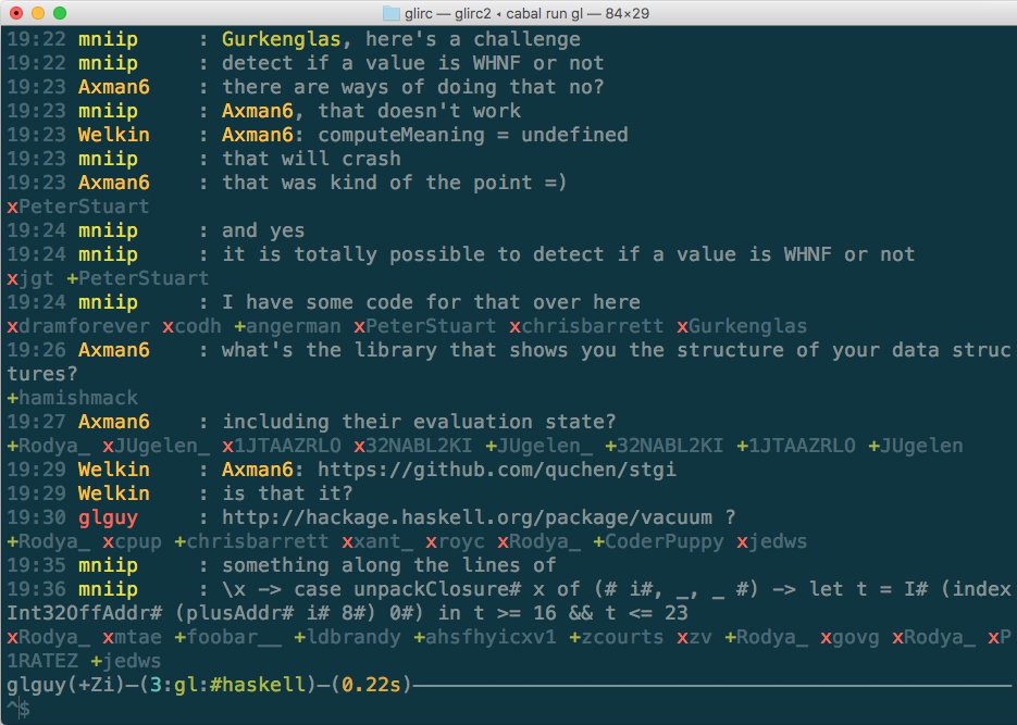 I made a video of me using glirc (my IRC client). If you were ever curious what glirc was like this could save you a compile: https://www.youtube.com/watch?v=taz0-hZwWP4 …https://github.com/glguy/irc-core