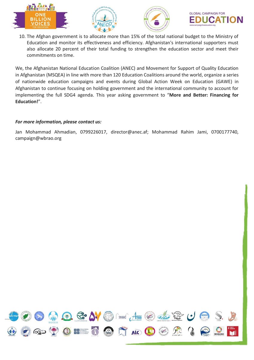POSITION PAPER Education for All Campaign, Global Action Week 2021 “Peace and Future of Education in Afghanistan!” More and Better Financing for Education!