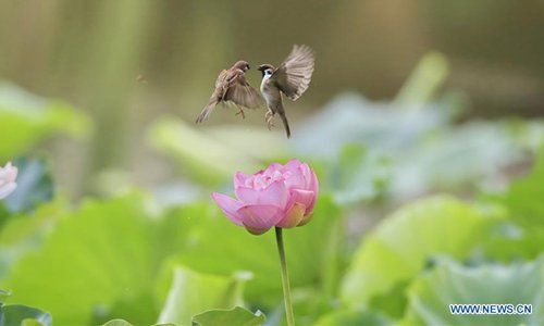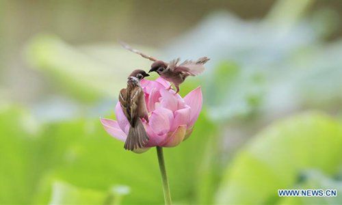 Sparrows seen over lotus flower at Zizhuyuan Park in Beijing http://bit.ly/2J82sRO pic.twitter.com/OVqqzlHnni