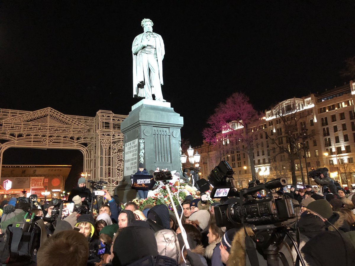 Люди всё ещё прибывают на Пушкинскую площадь. Некоторые из них приехали в Манежной, где также в эти минуты проходит акция памяти жертв в Кемерове.pic.twitter.com/seElNBMYdM