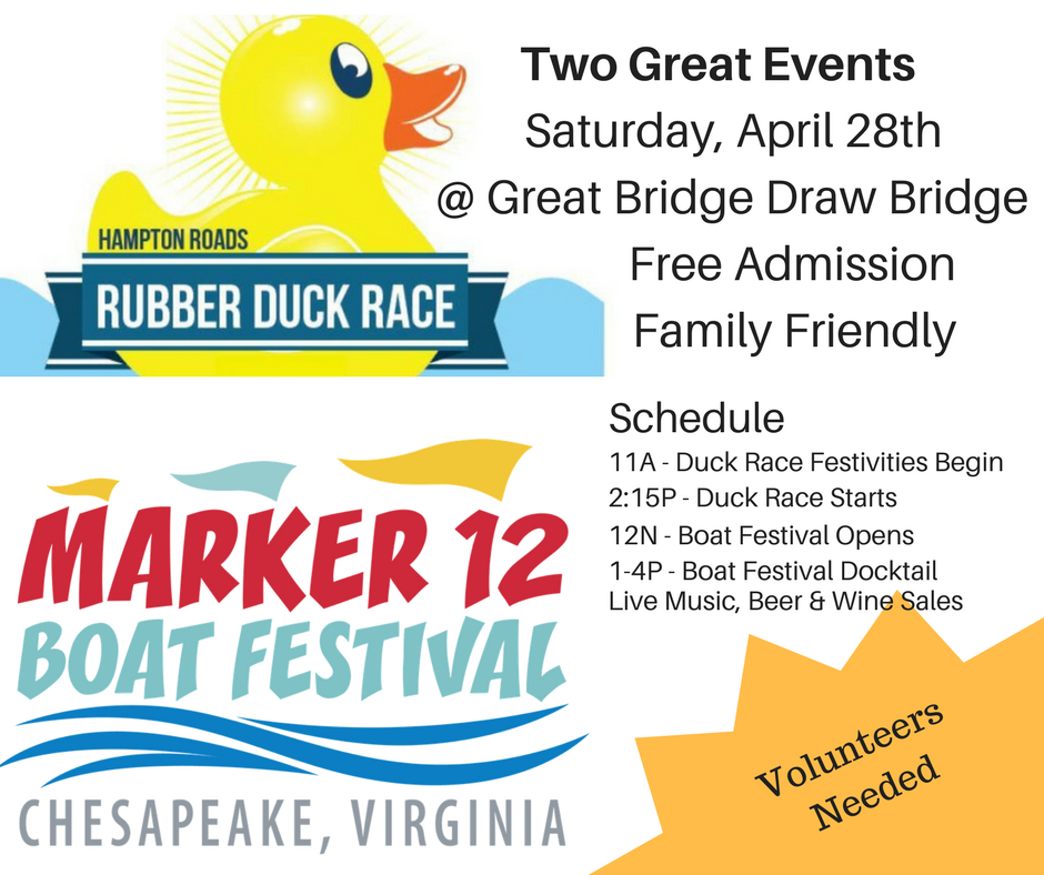 #Marker12! On Sat, stop at#AtlanticYachtBasin for the Marker 12 Boat Fest and experience Virginia’s only Rubber Duck Race. Join us at the Docktail from 1-4P. Live music, beer & wine for sale.@yachtrepairs@CHIPofSHRpic.twitter.com/URO2Rw8c04