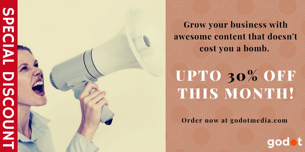 We are running big discounts on content writing services - upto 30% this month! Get your hands on the deal at https://www.godotmedia.com/ .