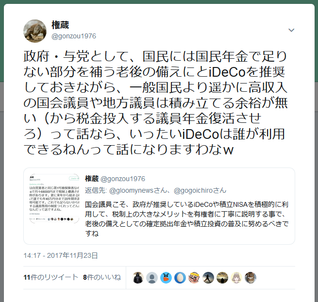 そもそも国民には公的年金だけでは足らん老後の備えとしてiDeCo(や積立NISA)による自助努力を推奨しておいて、議員だけは国民年金だけでは老後不安だから税金投入の議員年金を復活させろとかふざけとるにもほどがあるで 維新は「国会議員や地方議員こそ率先してiDeCoを活用すべき」と言わなあかんでpic.twitter.com/nhXgFPiDqS