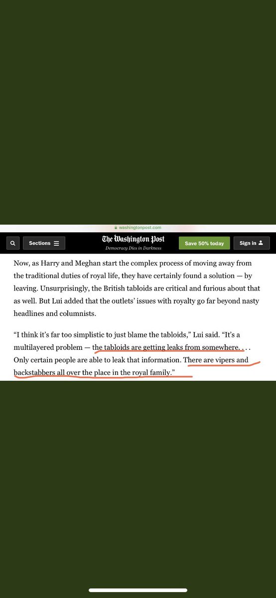 Throwback: “it’s far too simplistic to just blame the tabs. It’s a multilayered problem — the tabloids are getting leaks from somewhere...Only certain ppl are able to leak that info. There are vipers & backstabbers all over the place in the royal family.”https://www.washingtonpost.com/lifestyle/style/how-much-did-the-british-tabloids-brutal-coverage-of-harry-and-meghan-impact-their-decision-to-step-back/2020/01/09/13a794aa-330f-11ea-91fd-82d4e04a3fac_story.html …